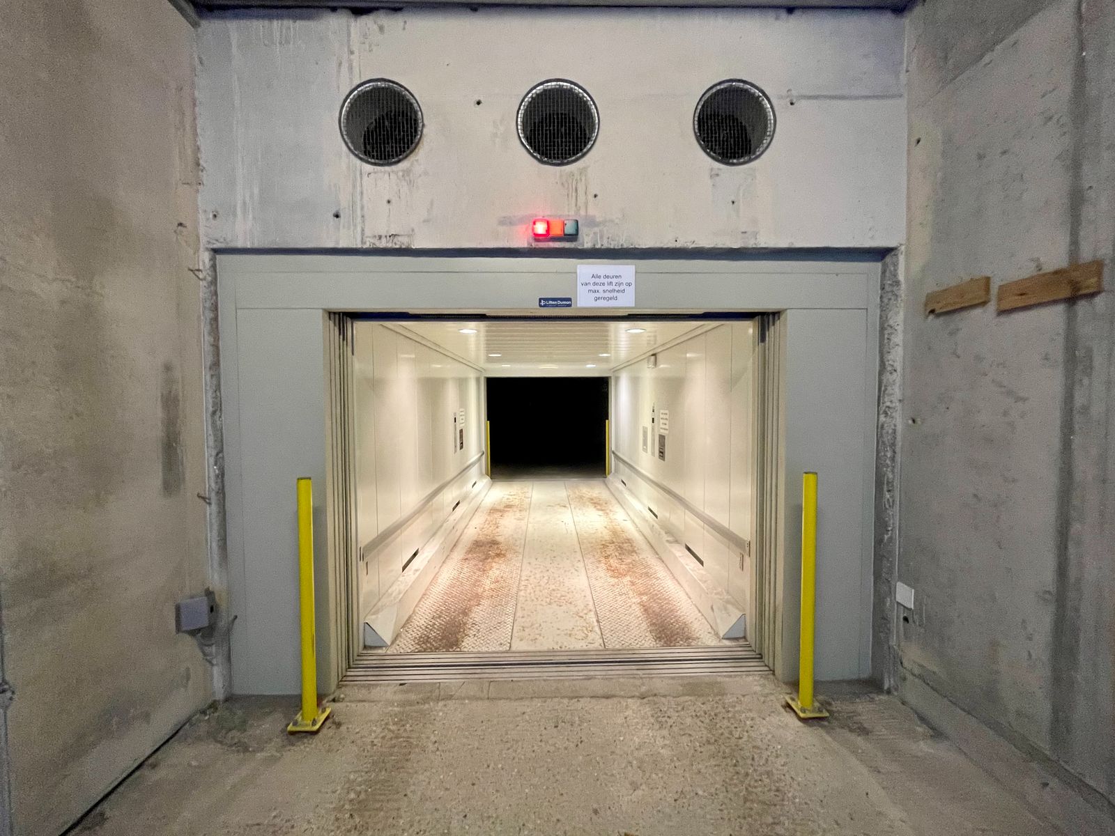 Wagen wordt in liftkooi gereden.