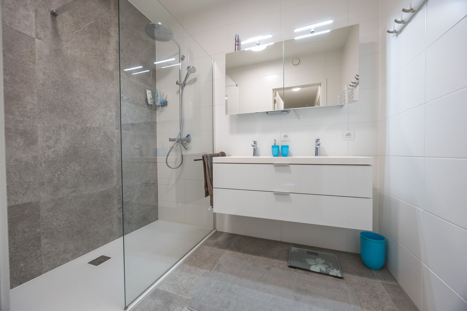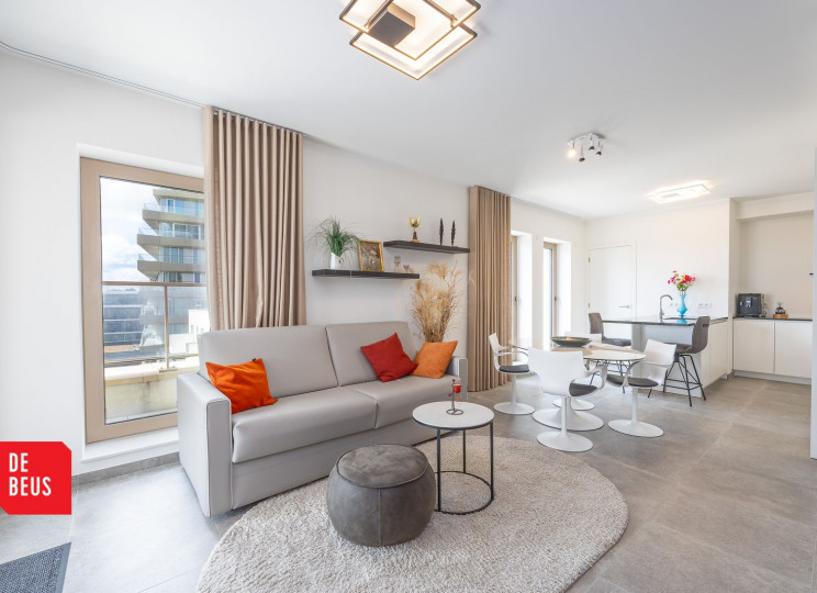 INDELING: inkomhal, lichtrijke woonkamer met toegang tot het zonnig terras, volledig ingerichte open keuken voorzien van kwalitatieve toestellen, twee volwaardige slaapkamers met ingemaakte kasten, badkamer met inloopdouche en wastafelmeubel, afzonderlijk toilet en praktische berging.