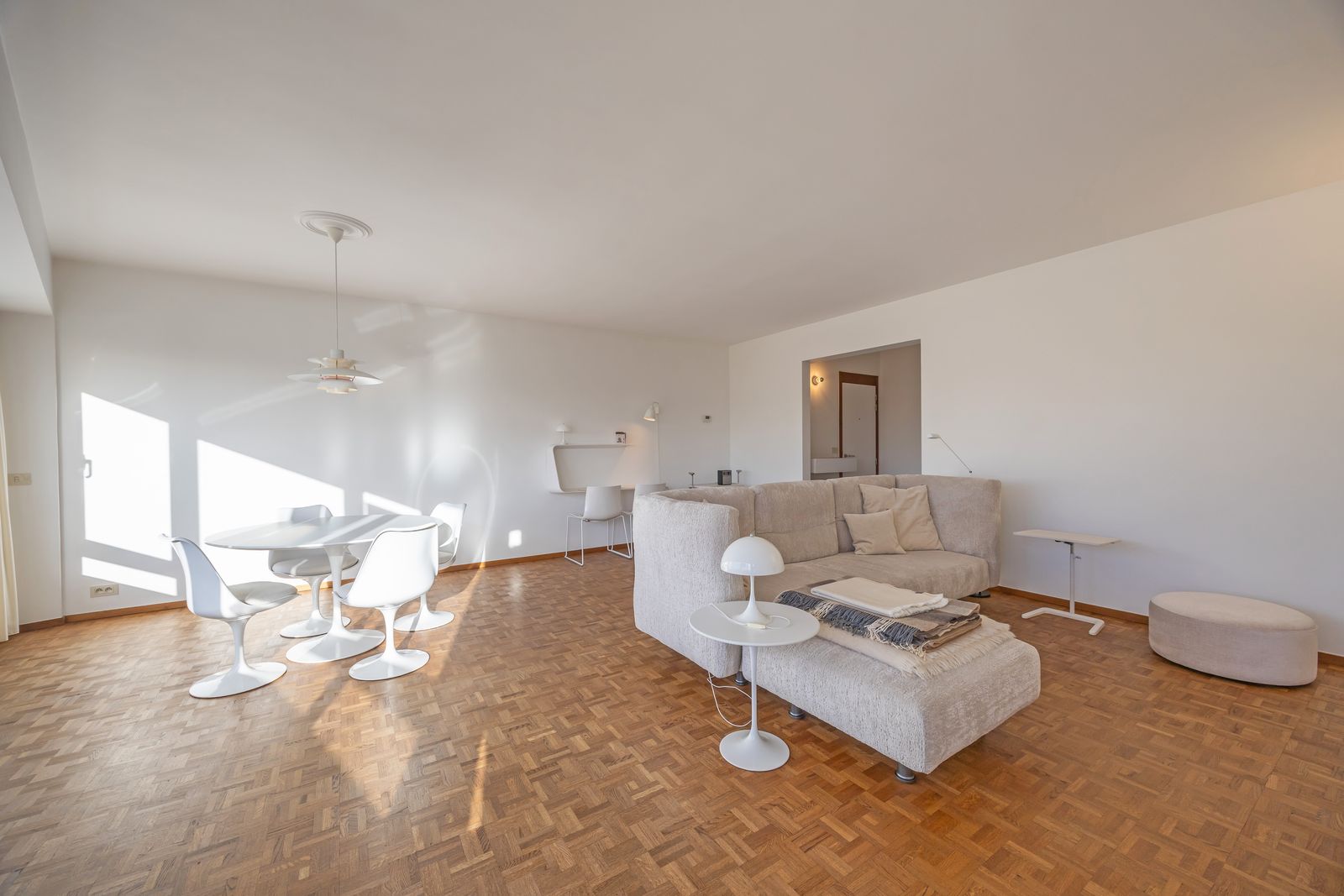 De ruime en elegante leefruimte straalt klasse en comfort uit en sluit naadloos aan op een hoogwaardig afgewerkte keuken met moderne toestellen.