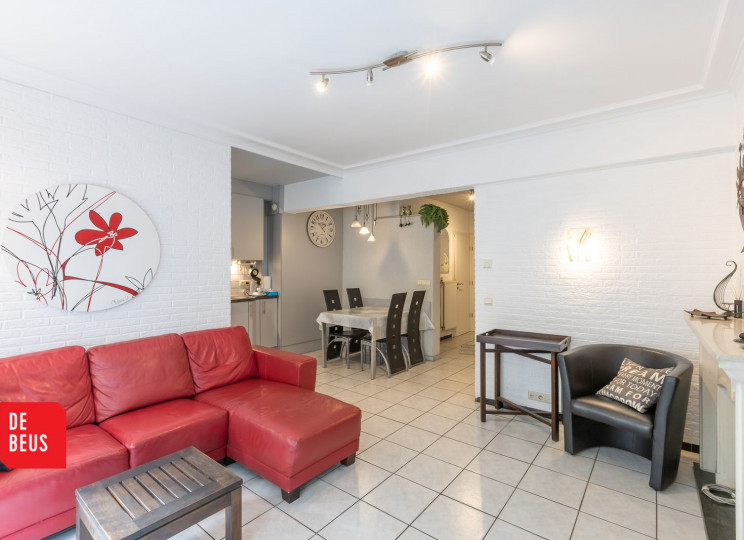 Indeling: inkom, lichtrijke woonkamer, volledige ingerichte halfopen keuken met veel bergruimte, toegang tot terrasje, twee slaapkamers, badkamer met douche, afzonderlijk toilet.