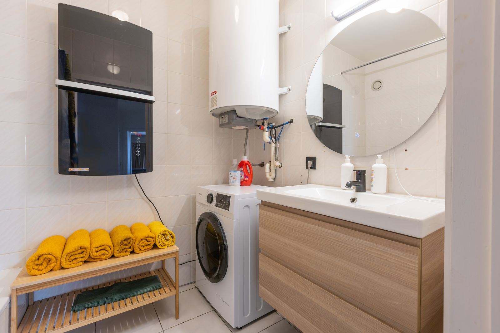 Indeling: inkom met vestiaire, grote lichtrijke woonkamer met veel raampartijen, zonnig terras, volledig ingerichte keuken, drie slaapkamers, badkamer met ligbad, wastafel en aansluiting wasmachine/ droogkast, afzonderlijk toilet.