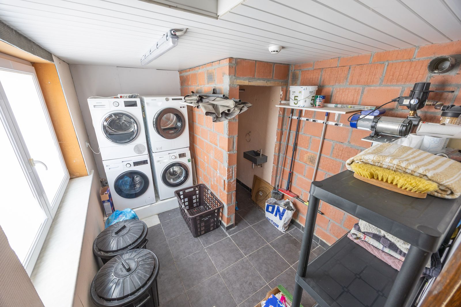 Het gelijkvloers biedt doorgang naar de wasruimte en het tof ingerichte achterhuis bestaande uit: een grote eetruimte met een volledig uitgeruste keuken voorzien van alle nodige toestellen en veel kastruimte en tot slot een mezzanine ingericht als ontspanningsruimte. Extra troef: zonnig terras!