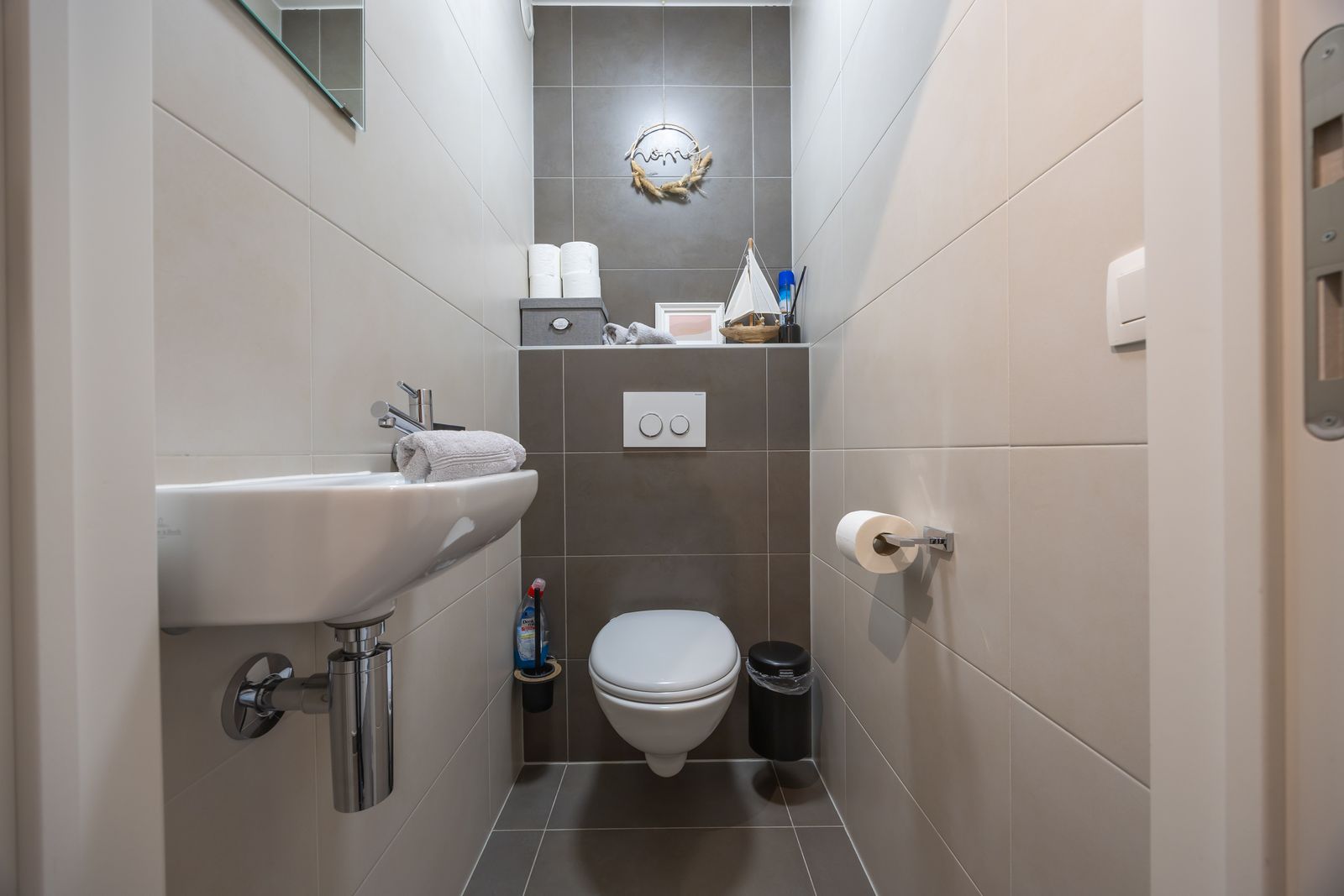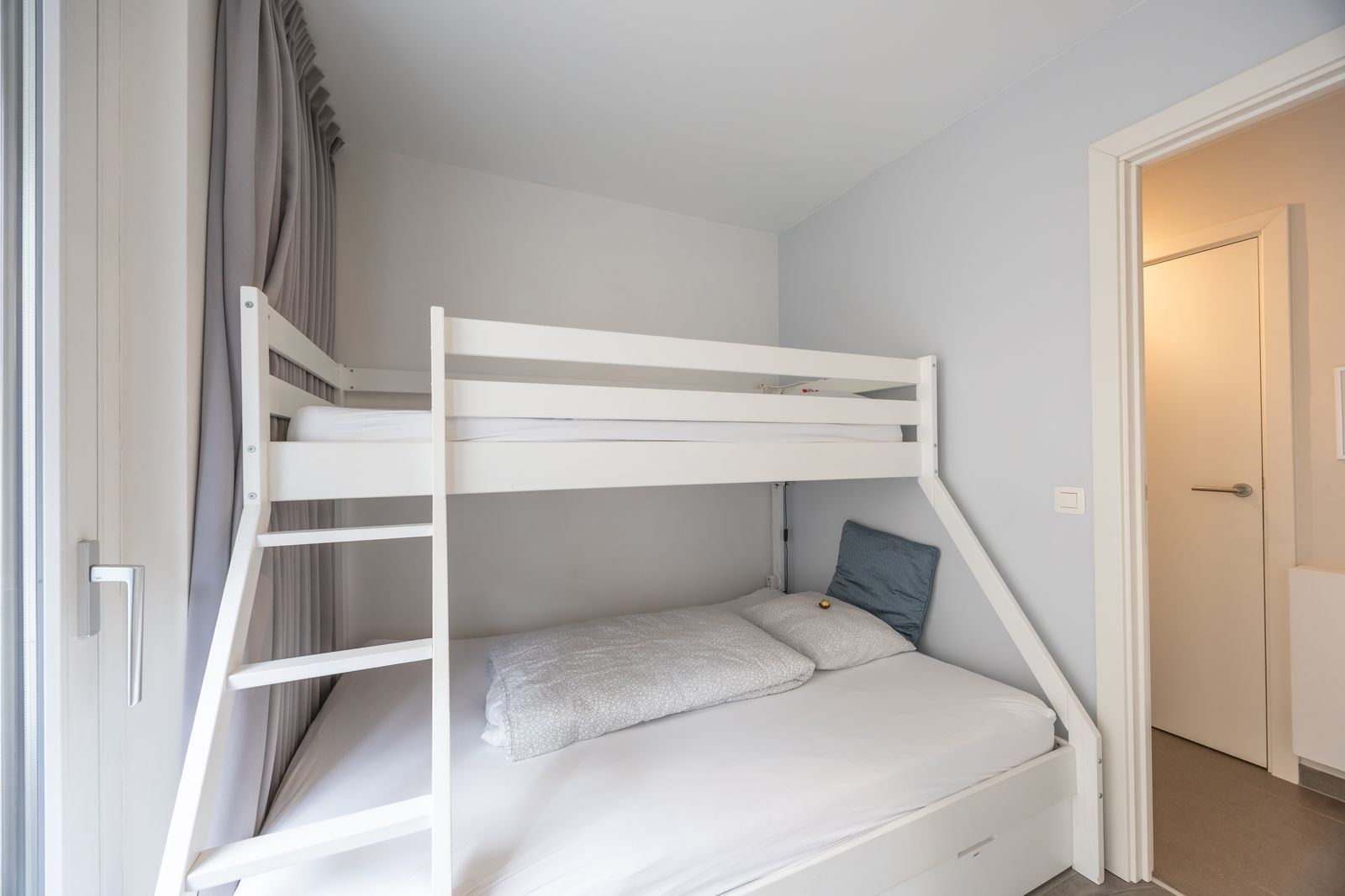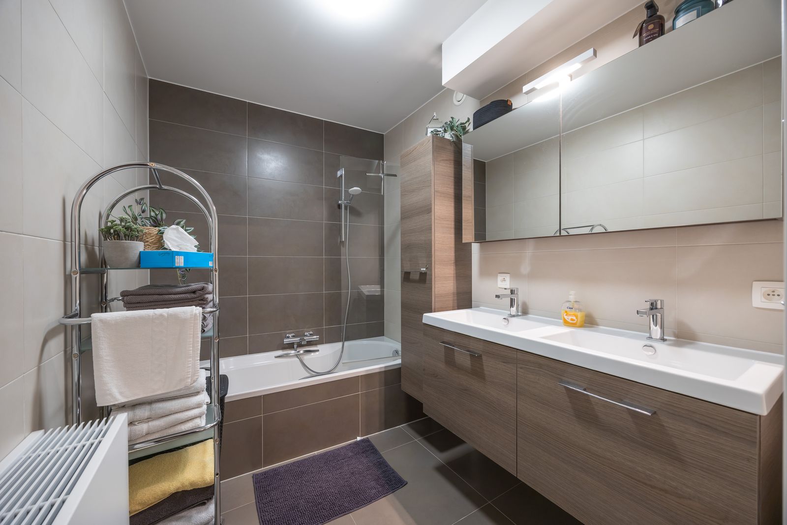 Indeling: inkomhal met vestiaire, zeer lichtrijke woonkamer met veel raampartijen, gezellig terras, volledig ingerichte keuken uitgerust met alle nodige kwalitatieve toestellen, berging met aansluiting voor wasmachine/ droogkast, twee slaapkamers waarvan één met zongericht terras, badkamer voorzien van ligbad met douchefunctie en dubbele wastafel, afzonderlijk toilet.